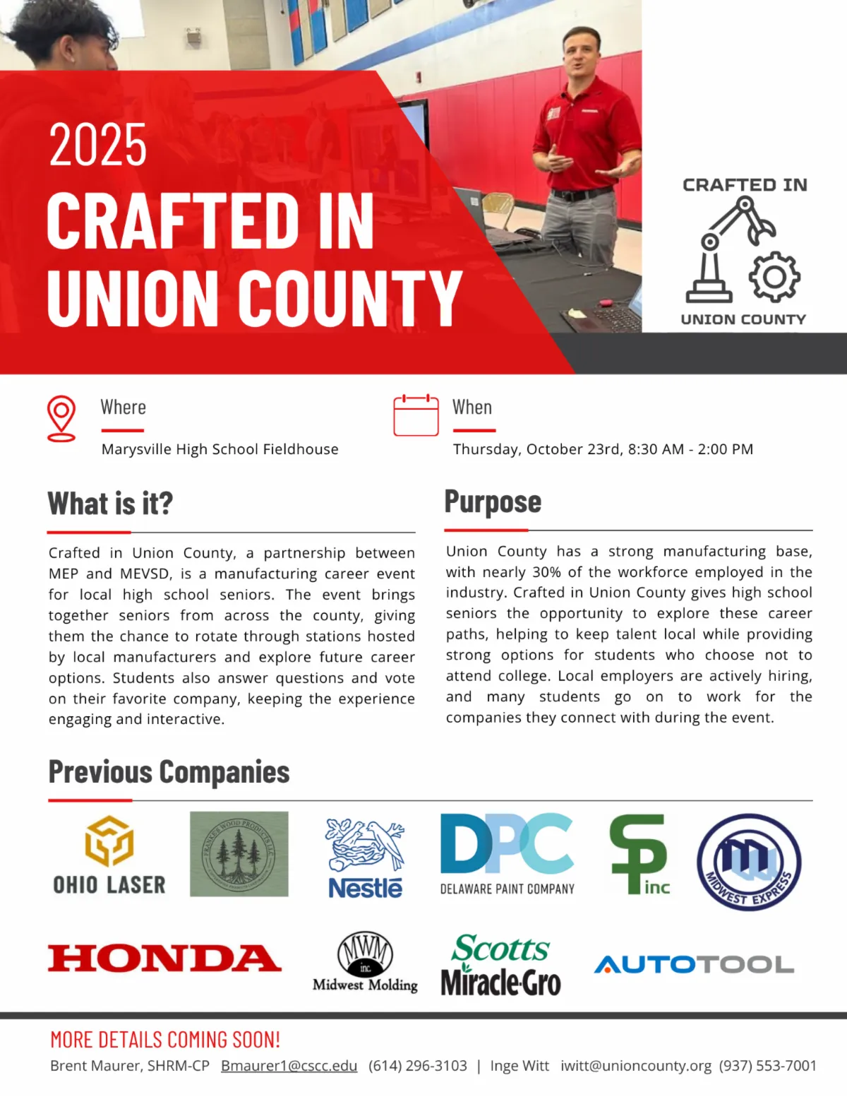 高校生と地元の製造会社をつなぐイベント「Crafted in Union County」が今年10月23日に開催されます。ユニオン郡では労働力の 30% 近くが製造業に従事しているため、将来の労働力を強化するためには、学生が気づいていないかもしれないキャリア機会に学生を参加させることが不可欠です。イベントに先立ち、製造業月間ではビジネスインパクト・ブレックファストが開催され、業界について学ぶ機会がもう1つあります。